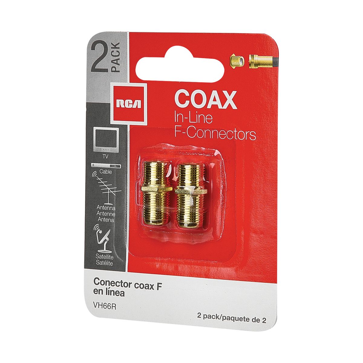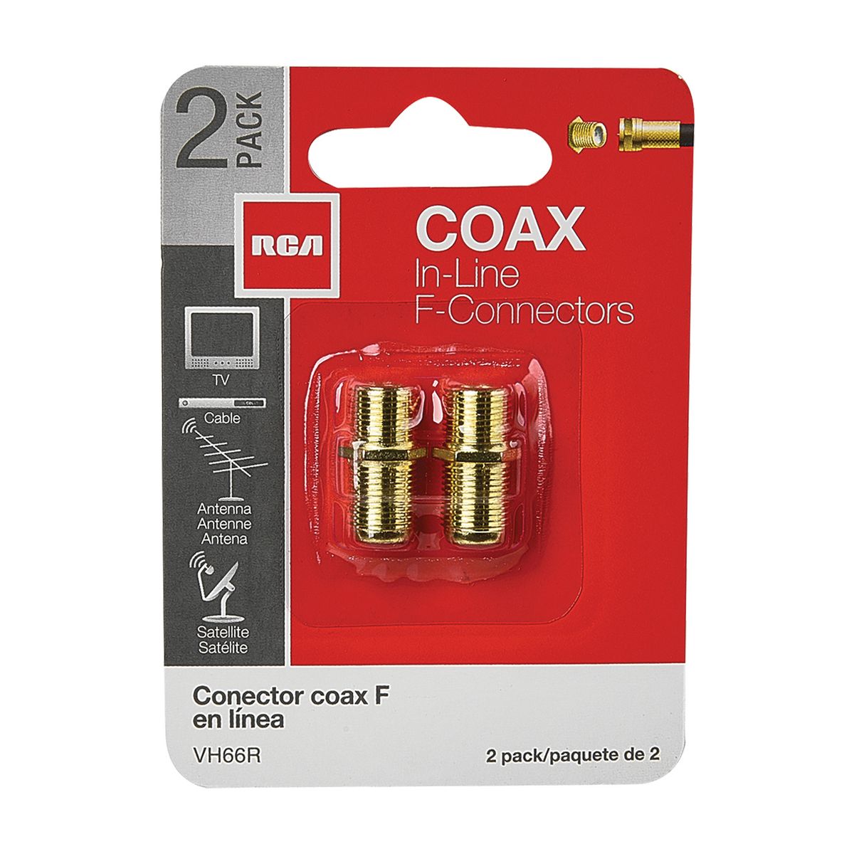 Ideal for all types of coax signals, including cable TV, VCR, and satellite setups, the RCA VHR66R is 2 Pack of RCA In-Line F-Connectors. It is designed for connecting or joining up 2 F-pin coaxial cables. It gives you a reliable and precise connection with the corrosion-resistant gold-plated connectors. Use this to connect RG6 or RG59 coax.