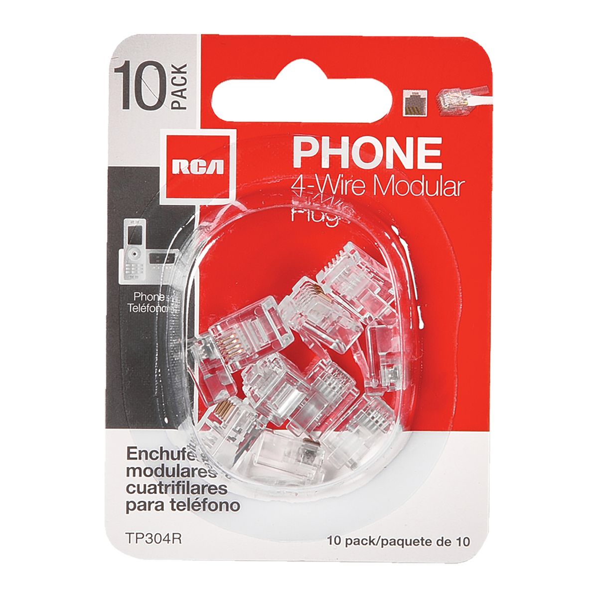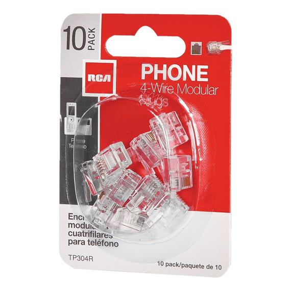 Each RCA 4-wire Modular Phone Line Plug terminates phone wire for modular connections. Installation is quick and easy - simply strip the modular cable insulation 1/4 in. and insert wire into modular plug and crimp contacts to wire. Be sure to maintain existing color codes of your current phone cables. This is a 10 piece pack and the connectors are clear._