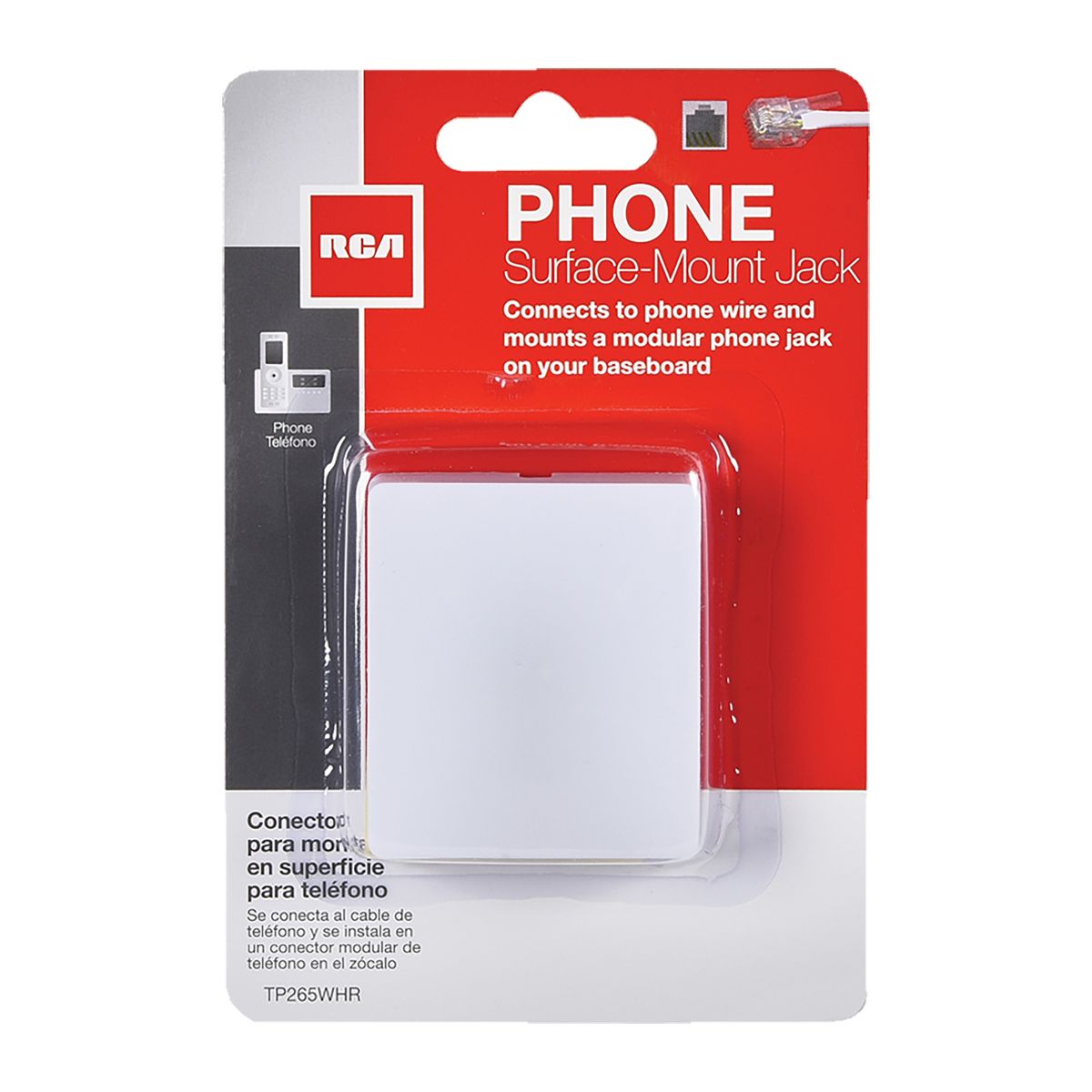 The RCA TP265WHR Surface-Mount Baseboard Phone Jack connects to an existing phone wire and mounts a modular phone jack on your baseboard for quick and easy installation. It can also be used for a temporary setup, if you don't want to change an existing wall structure or when you need a phone jack in a specific location without extensive rewiring. The white jack is constructed with durable materials.