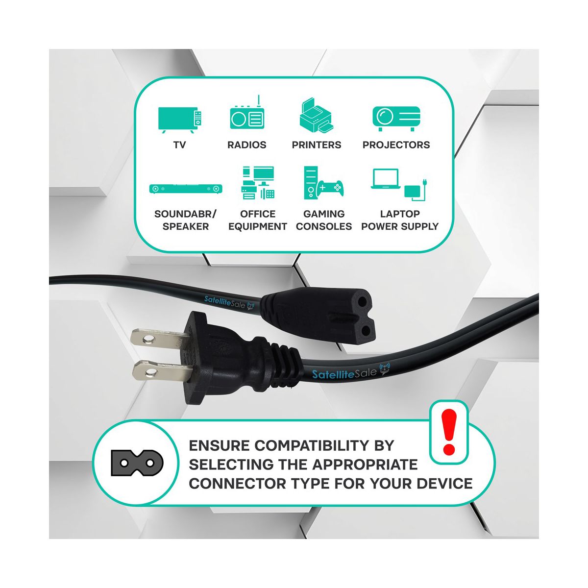 SatelliteSale 2-Prong to Round Connector AC Universal Replacement Universal Wire Power Cable PVC Black Cord ensures a great and reliable power transmission to your gadgets. It is an essential cord to buy when it comes to plugging -in gaming consoles, laptop computers, tablets, and TVs. Our Universal Replacement Power Cable is an easy-to-use, plug-n-play accessory. It provides an uninterrupted 110V AC electric connection to the connected devices. A PVC jacket combines a simple, minimalistic design and safety of the cord, preventing bending damage. Round Connectors fit in the device's inlet perfectly, and won't get loose or fall out. Comes in lengths of 6 feet and 15 feet long cables. SatelliteSale 2-Prong to Round Connector AC Universal Replacement Power Cable is perfect for users who regularly plug and unplug cables. Our cord provides excellent compatibility with a wide range of devices and works well as a spare cord. Plug in your gaming consoles, printers, scanners, office equipment, electric shavers, Radios, Tablets, Desktop, and Laptop computers, Monitors, entertainment and music systems, or any other devices with a 2 pin power connection. Every cable we sell is a perfect match for both commercial and residential use: you can replace your existing overused, old, broken, damaged, or misplaced power cable and even add some extra length between devices for your convenience. Rated for use with 110V,10A input, which is perfect for North American power outlets (USA, Canada). Please, check the product pictures to make sure this cable is compatible with your devices. In addition, we assure the lifetime service of each cord to deliver a positive experience to our clients. Please, check what kind of 2-pin power connection you have before buying our cord. We offer both Square and Round Connectors for your convenience!
