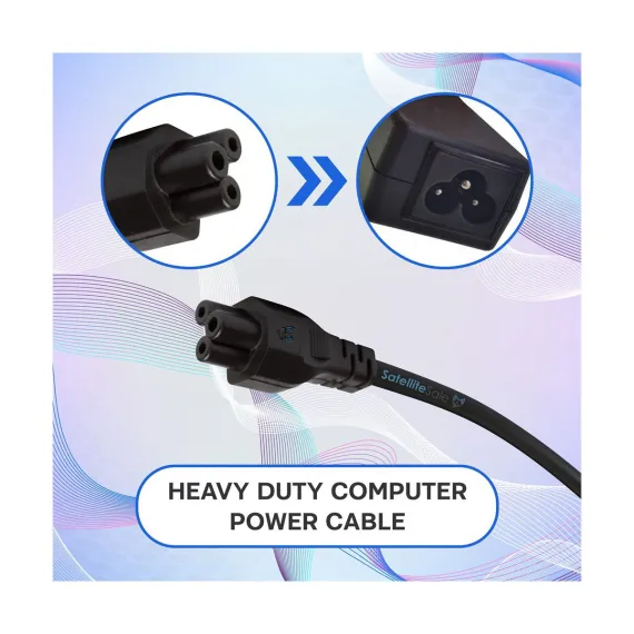 SatelliteSale Universal Heavy Duty Computer Power Cable Male NEMA 5-15P to Female IEC C5 Universal Wire ensures a great and reliable power transmission to your gadgets. It is an essential cord to buy when it comes to plugging-in laptop computers with a three-slot power supply adapter. Our e Universal Heavy Duty Computer Power Cable is an easy-to-use, plug-'n'-play accessory. It provides an uninterrupted electric connection to the connected devices. A PVC jacket combines a simple, minimalistic design and safety of the cord, preventing bending damage. C5 connectors fit in the device's inlet perfectly, and won't get loose or fall out. Comes in different lengths of 6 feet and 15 feet. SatelliteSale Universal Heavy Duty Computer Power Cable Male NEMA 5-15P to Female C5 is perfect for users who regularly plug and unplug cables. Our cord provides excellent compatibility with a wide range of devices and works well as a spare cord. Plug-in your modern computers, laptops, most power bricks for laptops/notebooks, monitors, scanners, printers, and other devices with a C5 power inlet. Every cable we sell is a perfect match for both commercial and residential use: you can replace your existing overused, old, broken, damaged, or misplaced power cable and even add some extra length between devices for your convenience. Rated for use with North American power outlets (USA, Canada). Please, check the product pictures to make sure this cable is compatible with your devices. In addition, we assure the lifetime service of each cord to deliver a positive experience to our clients.