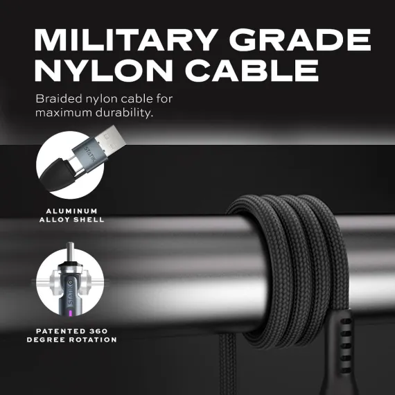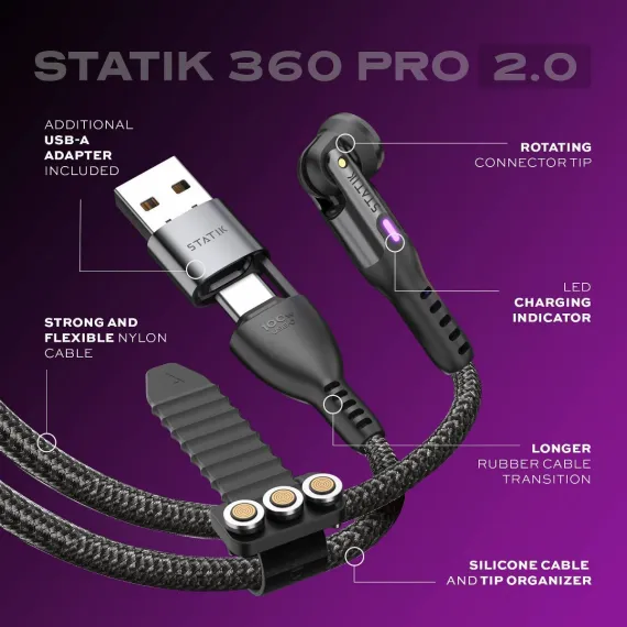 STATIK 10' 360-Degree Pro Universal Magnetic Charging Cable - Black: USB-C, Lightning, Micro USB, Braided Design
