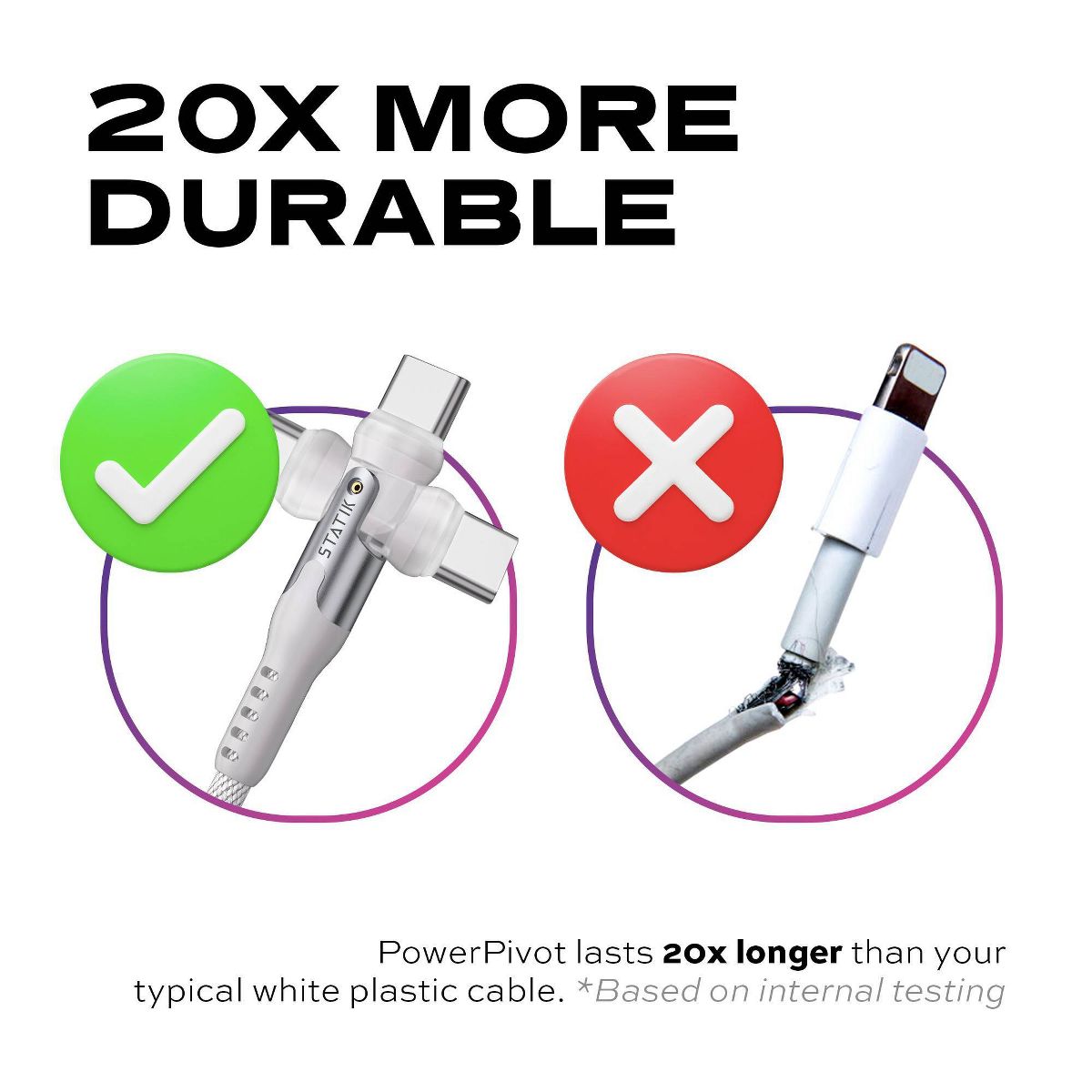 The PowerPivot™ Pro is a unique, patented and reliable solution for all your charging needs! Its rotating connector ensures that it stays out of your way, allowing you to use your phone in landscape or portrait mode without interruptions. Its military-grade nylon braided cable design prevents fraying, offering enhanced durability for prolonged use. Additionally, rapid data transfer capabilities enable seamless movement of photos, videos, music, and more, while built-in safety features protect your battery and devices. An LED charging light indicator conveniently signals when your device is charging, reducing the need to constantly check your phone's battery. The PowerPivot Pro includes a USB-C with USB-A adapter end for extra charging capabilities!