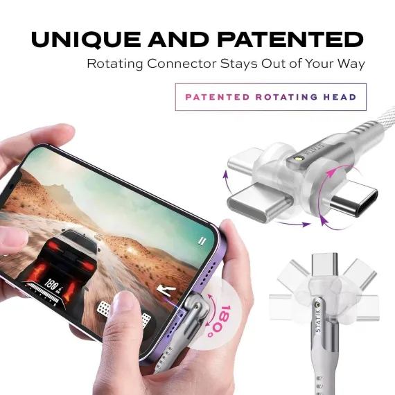 The PowerPivot™ Pro is a unique, patented and reliable solution for all your charging needs! Its rotating connector ensures that it stays out of your way, allowing you to use your phone in landscape or portrait mode without interruptions. Its military-grade nylon braided cable design prevents fraying, offering enhanced durability for prolonged use. Additionally, rapid data transfer capabilities enable seamless movement of photos, videos, music, and more, while built-in safety features protect your battery and devices. An LED charging light indicator conveniently signals when your device is charging, reducing the need to constantly check your phone's battery. The PowerPivot Pro includes a USB-C with USB-A adapter end for extra charging capabilities!