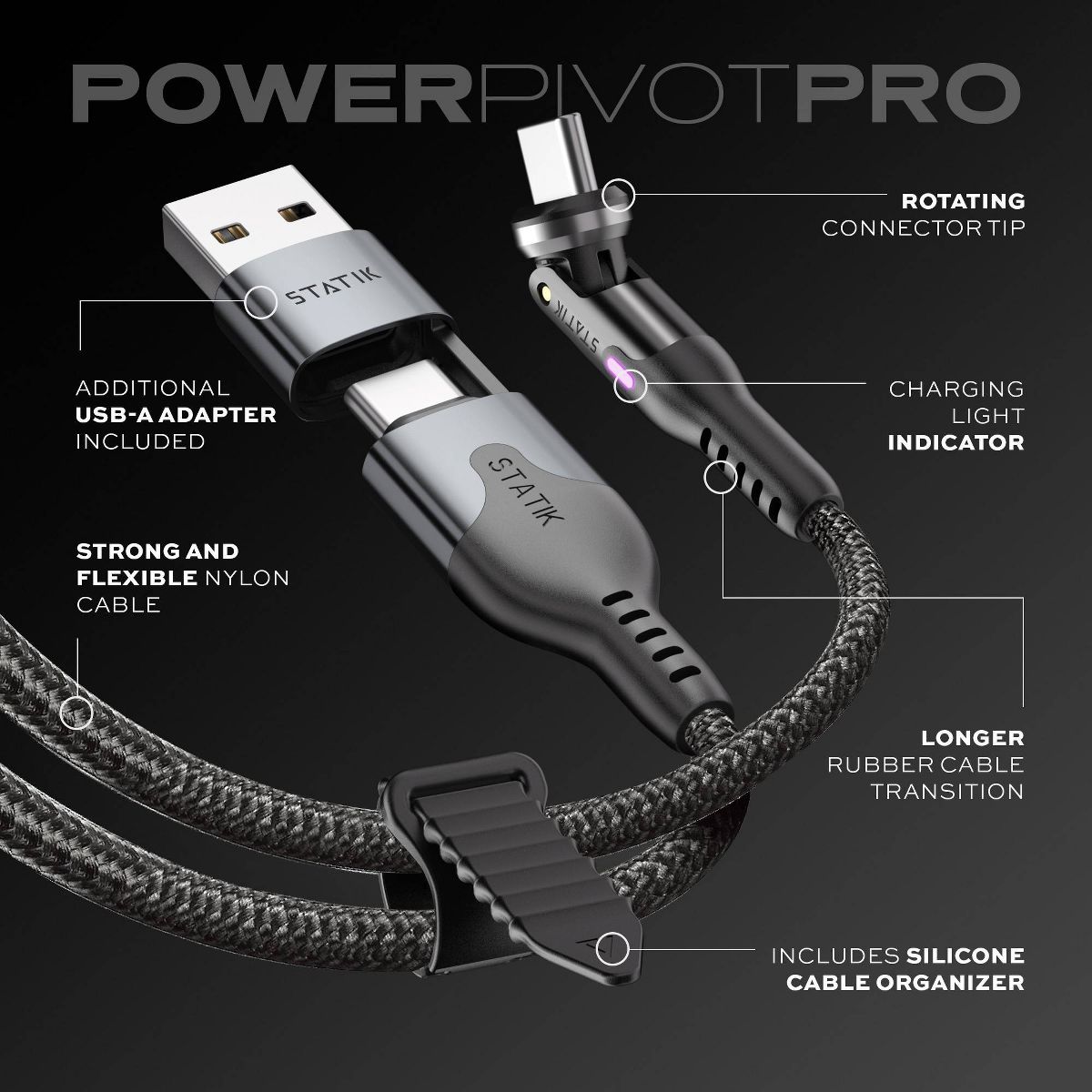 STATIK 3.3' PowerPivot Pro 360-Degree Nylon Braided USB-C to USB-C Charging Cable - Black: 480 Mbps Male-To-Male Data Cable
