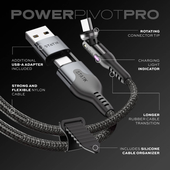 The PowerPivot™ Pro is a unique, patented and reliable solution for all your charging needs! Its rotating connector ensures that it stays out of your way, allowing you to use your phone in landscape or portrait mode without interruptions. Its military-grade nylon braided cable design prevents fraying, offering enhanced durability for prolonged use. Additionally, rapid data transfer capabilities enable seamless movement of photos, videos, music, and more, while built-in safety features protect your battery and devices. An LED charging light indicator conveniently signals when your device is charging, reducing the need to constantly check your phone's battery. The PowerPivot Pro includes a USB-C with USB-A adapter end for extra charging capabilities!