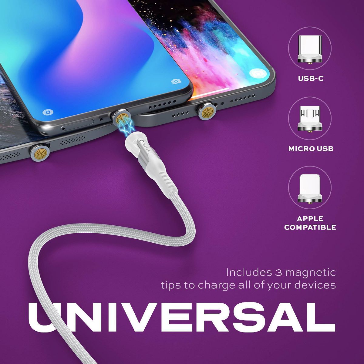 STATIK 6.6' 360-Degree Pro Universal Magnetic Charging Cable - White: USB, Micro USB, Apple Lightning, USB-C Connectors