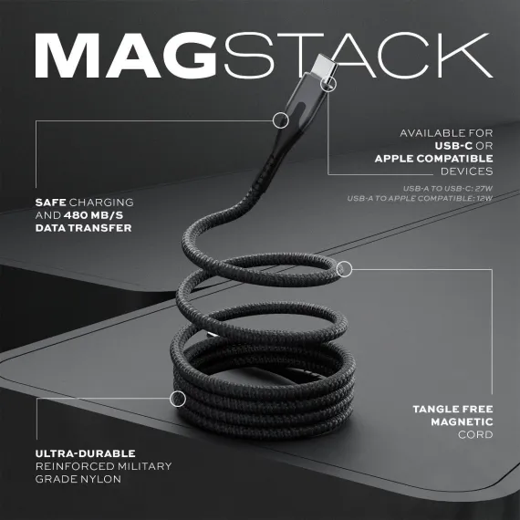 Say goodbye to tangled cables forever! The MagStack™ line utilizes innovative magnetic technology to keep your cables neatly organized. Its ultra-durable braided nylon construction resists wear and tear and prevents fraying. With swift transfer speeds and compatibility with both Apple and Android devices, this exceptional cable offers a complete charging and data solution.