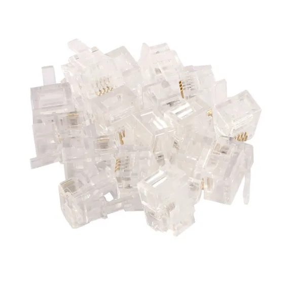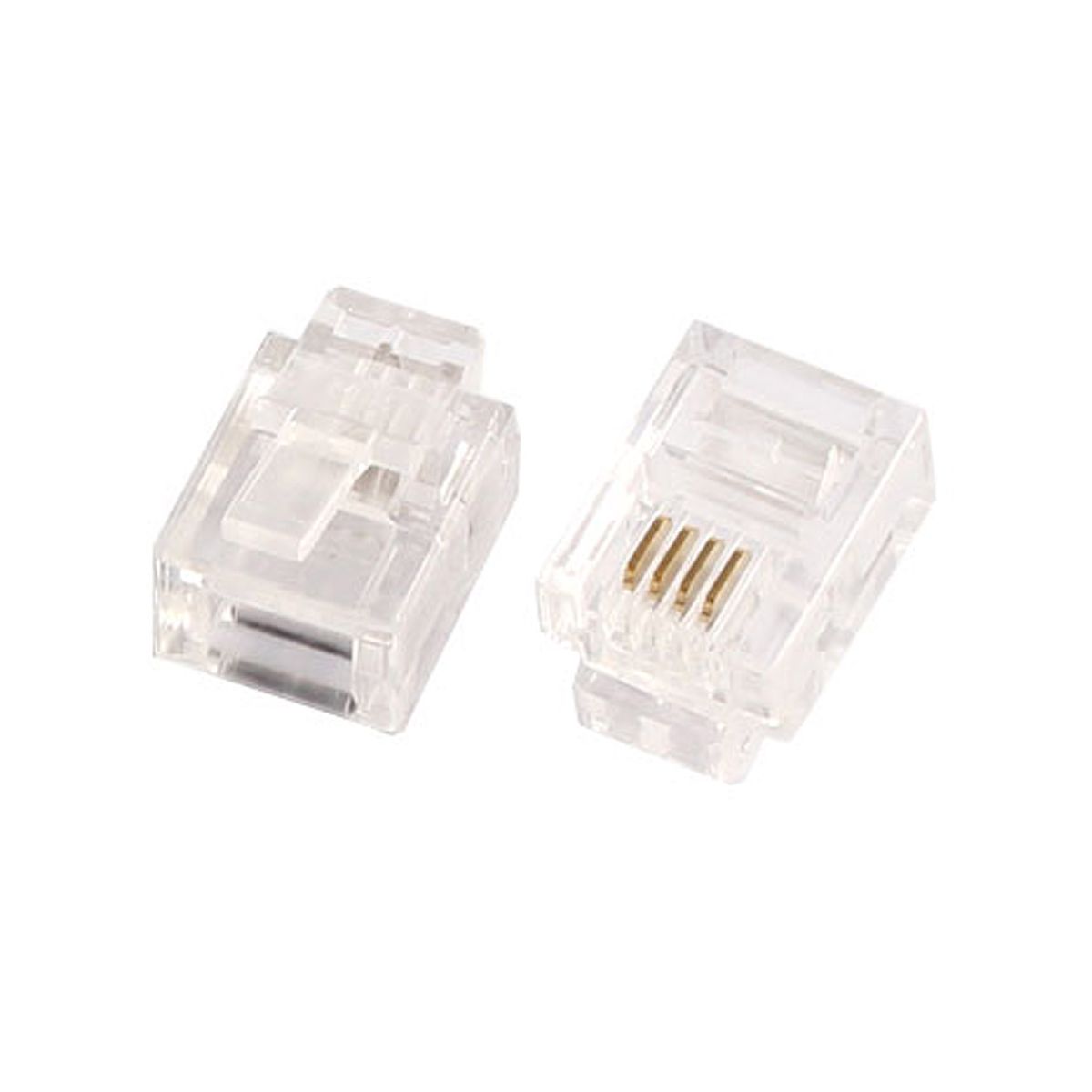 This product features a 6 position and 4 contacts head, known as a 6P4C head. It is suitable for standard telephone handset flat stranded cables and is widely used in home or office cable systems. The clear plastic housing with gold-plated contacts ensures fast and accurate data transmission. Dimensions: 15 x 10 x 10mm.
