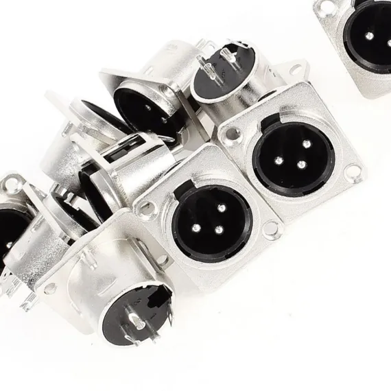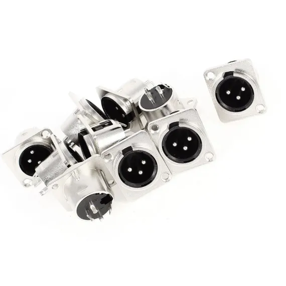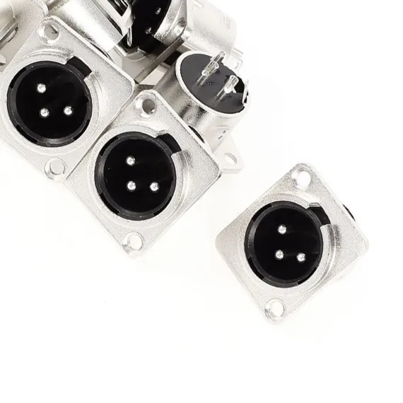 Male 3 terminals PCB Panel Mount Socket is suitable for panel installations where the connectors are in close contact to enhance conductivity and minimize wear between the sockets. XLR Panel Mount Sockets are used for microphone, amplifier and audio equipment cable wiring. The socket has a metal housing that withstands long-term use and frequent connections. It features a 3-pin design suitable for most audio device connection needs. The socket provides quality audio signal transmission, suitable for mixing consoles and audio equipment.