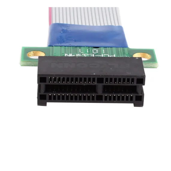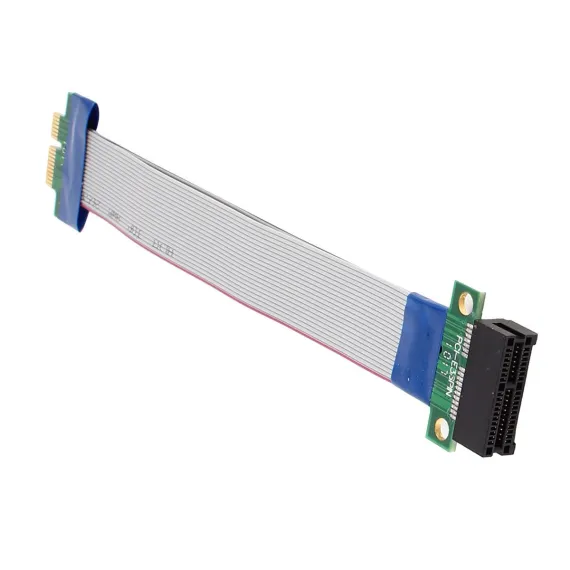 The PCI-E express 1x slot riser card extension cable is designed to extend the reach of a PCI-E 1x slot. This high-speed cable helps to keep operating temperatures lower. Its space-saving design with a flexible ribbon cable takes up minimal space and enables neat and compact wiring. The cable features a PCI slot soldered with a normal IDE ribbon cable and requires no driver, although it does not support hot swappable. One end is PCI-E 1X male and the other end is PCI-E 1X female. The main colors of the cable are gray, green, black, and gold tone, and it is made from plastic, electronic parts, and metal.