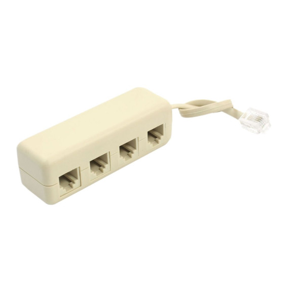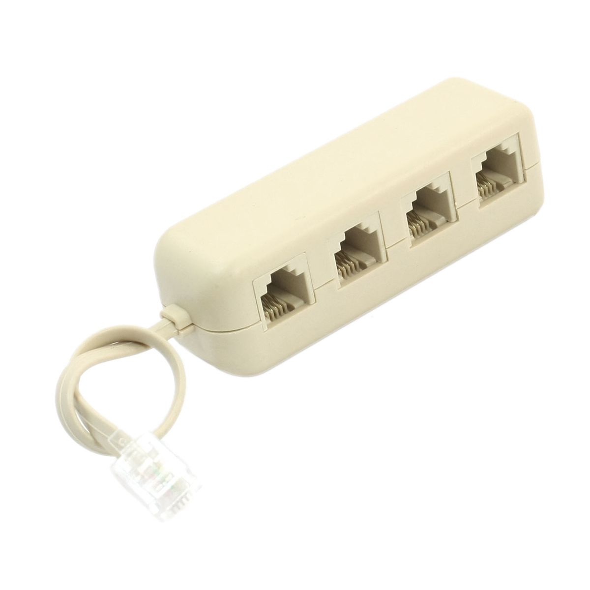 The male end of this connector is an RJ11 6P4C Male that can be connected to a phone line or other compatible device. The female head is a four 6P4C Female socket that can be used to connect multiple RJ11 plug devices such as phones and modems. RJ11 is the standard telephone line interface with a 6-position, 4-metal contact point configuration. With this RJ11 telephone line connector, you can expand one RJ11 plug to four RJ11 plugs. The 4-way telephone line splitter is simple to plug and unplug and requires no additional tools. It is made of good-quality plastic material that provides stable signal transmission for a long service life. Suitable for all standard RJ11 devices such as landlines, fax machines, and office lines, it is ideal for home and office use. The splitter allows you to connect one device to multiple phones simultaneously with high interference immunity and HD sound quality.
