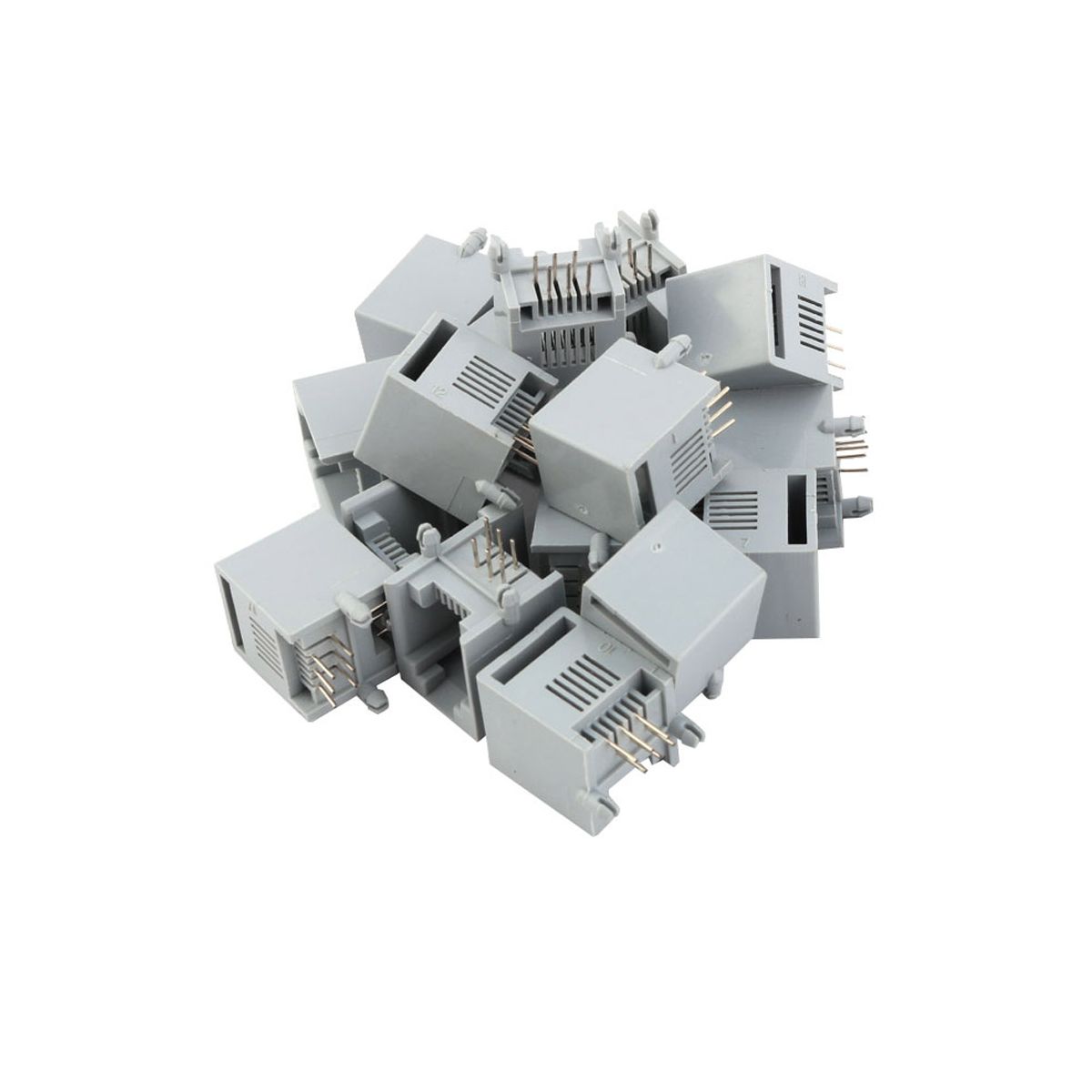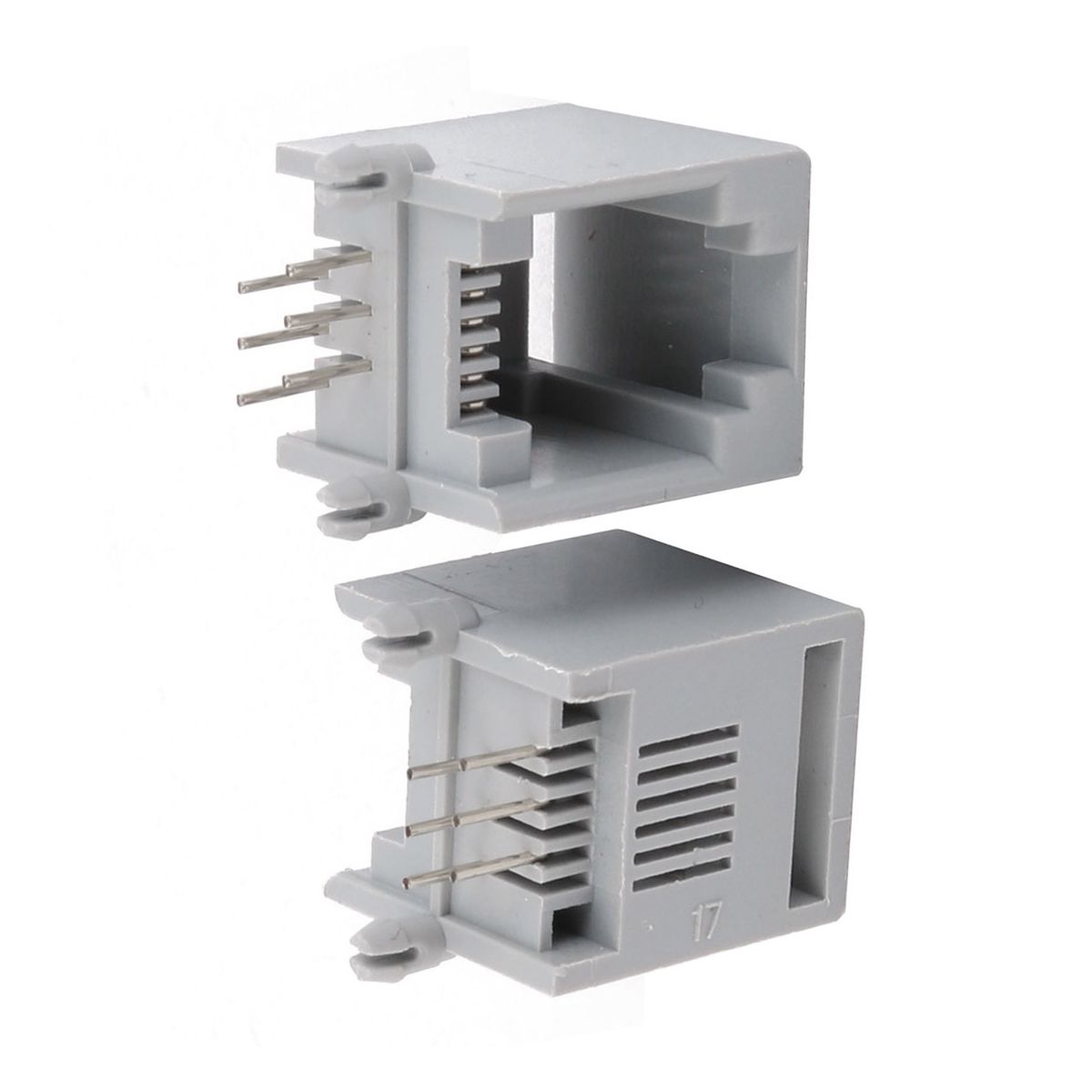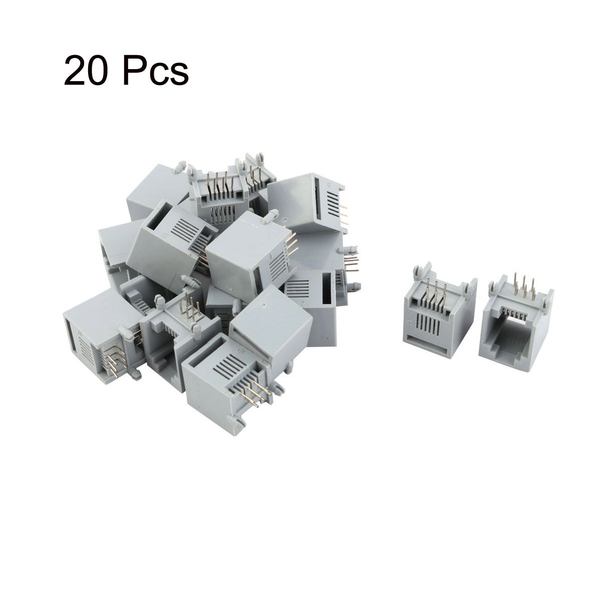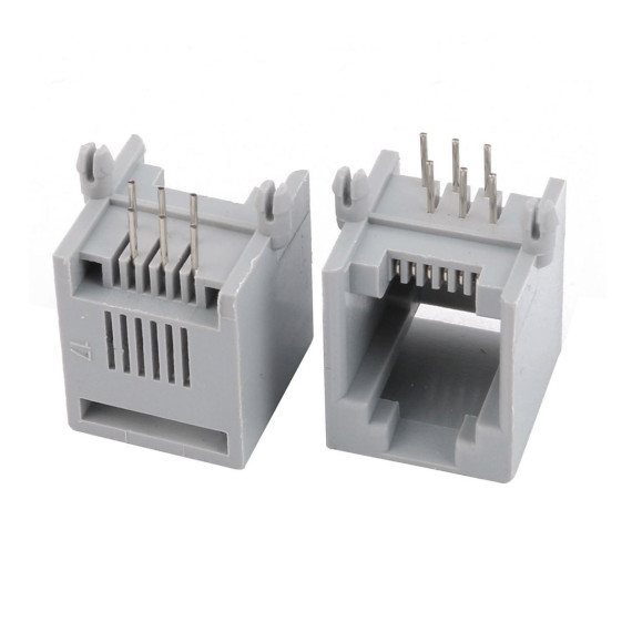 PCB mounting type modular jack for easy PCB mounting. RJ12 modular PCB jack telephone connector. Easy to soldering, suitable for the standard RJ12 cable, is used widely in home or office telephone system. Dimension: 15 x 13 x 13mm for easy installation. Package includes 20 RJ12 Modular PCB Jacks. Color: gray and silver tone.