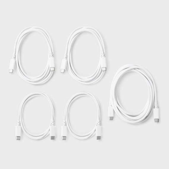 USB-C to USB-C Charging Cables (3'/3'/6'/6'/10') 5pk - dealworthy™ White: Male-To-Male Connectors