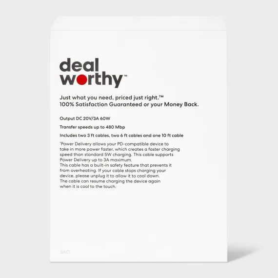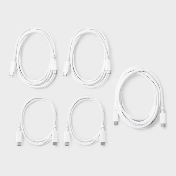 Stay powered up with the USB-C to USB-C Charging Cables (3'/3'/6'/6'/10') 5pk from dealworthy™ in White. The pack includes two 3-foot cords for on-the-go charging, two 6-foot cords for everyday use and one 10-foot cord for extended reach. Whether you're at home, at work or traveling, these durable cords ensure fast and reliable charging for your devices.