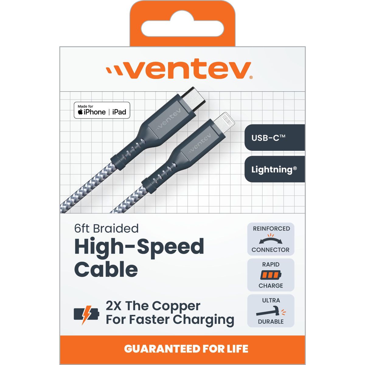Ventev Braided Usb-C To Apple Lightning High Speed 6 Foot Cable Gray