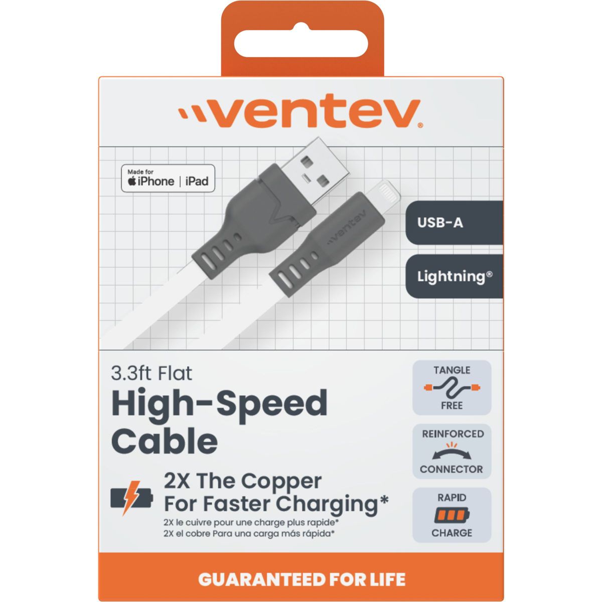 The more copper, the faster the charge. The Flat USB-A to Apple Lightning High Speed Tangle-Free Cable comes with 2x the copper versus a leading value cable, meaning it was designed to charge faster. The durable wrap on the cable and extended strain relief increase cable longevity. The unique flat cable design makes it tangle-free.