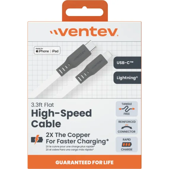 The more copper, the faster the charge. The Flat USB-C to Apple Lightning High Speed Tangle-Free Cable comes with 2x the copper versus a leading value cable, meaning it was designed to charge faster. The durable wrap on the cable and extended strain relief increase cable longevity. The unique flat cable design makes it tangle-free.