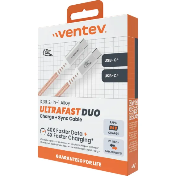 Ventev Ultrafast Duo Usb-C To Usb-C 2-In-1 High Speed & Data Transfer Ultra Durable 3 Foot Cable White