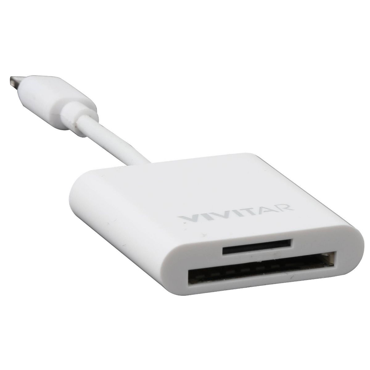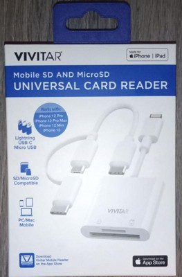The Vivitar Universal Card Reader for mobile SD cards and Micro SD cards gives you the all-in-one memory card reader for travel and professional usage! Our SD card reader comes with a USB C adapter, iPhone lightning cable attachment, and Micro-USB compatibility, giving you tons of options and ways you can use your mobile card reader and phone accessories. Whether you need to quickly examine footage from a trail camera or preview your best vacation shots from your video camera, the Vivitar card reader can give you immediate access to your files, whether they need to be transferred through USB type C or various other iPhone cords. Completely app-free and capable of reading/writing files extremely quickly, the Vivitar Universal Card Reader can handle almost anything, from smart phone videos to Apple cable file transfers!