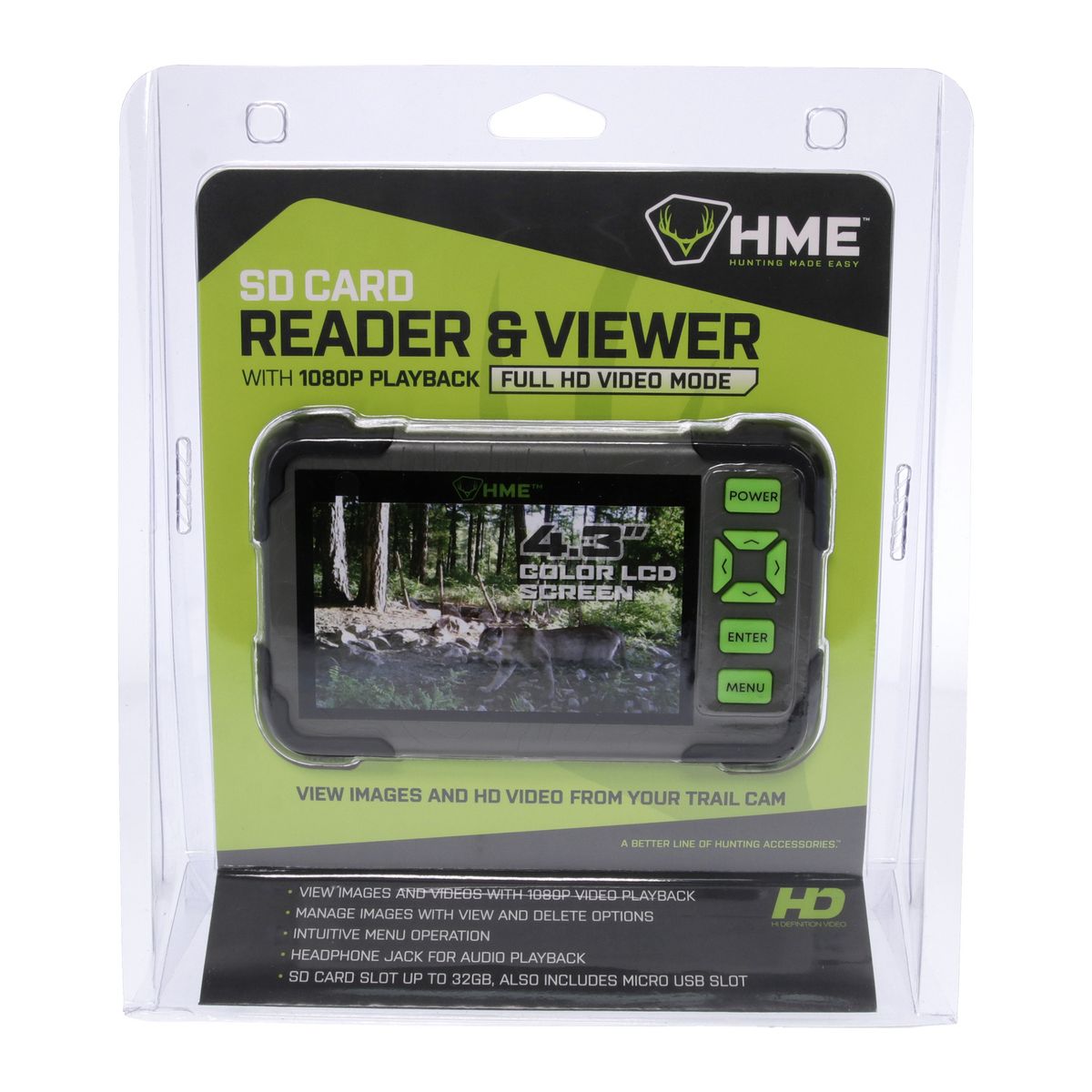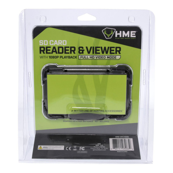 Need to view and/or read your SD™ Cards while on the go? You need the HME™ SD™ Card Reader/Viewer! It is designed so you can easily view your Cards from your Trail Cam while you are still out in the field or away from a computer. It features a vivid 4.3-in. color LCD screen with video playback resolution up to 1080p with Full HD video mode. It requires 4 AAA batteries, sold separately.