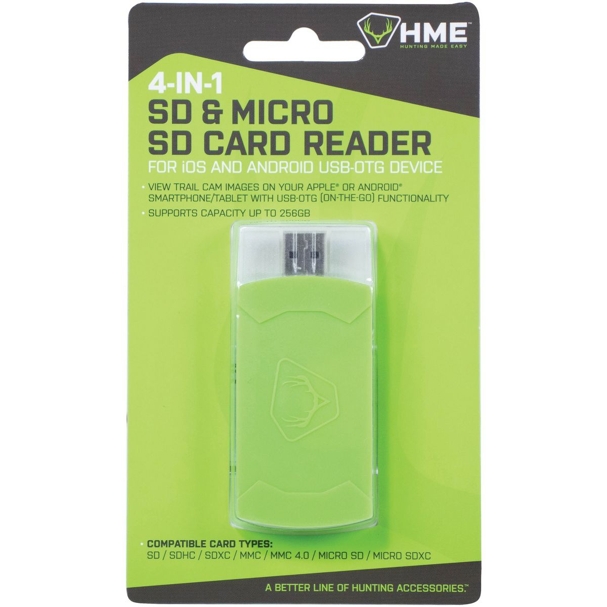 View trail cam images on your Apple or Android device with USB-OTG (On-the-Go) functionality with the HME 4:1 Card Reader. This trail cam Card Reader supports cards up to 256GB. The versatile design allows connection through micro USB, USB 2.0, USB-C and Lightning. Stay aware of what's on the trail with HME.
