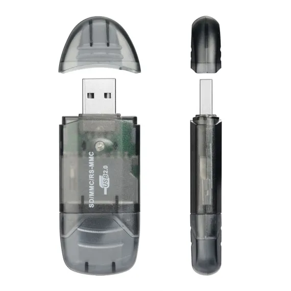 This USB 2.0 SDHC / SD / MMC memory card reader is the ideal companion for your digital media. Avoid the hassle of carrying a bulky card reader in order to transfer photos, music, data and more between PCs. Compact and portable design. Ideal for portable use on the road or at home with a desktop or laptop. Your data and pictures can be instantly transferred to your PC / Notebook. Instantly convert your SD / SDHC / MMC cards into a USB Flash Drive. Capacity: 64G. Features and Specifications:. Hot-Swappable. Plug and Play. USB 2.0. Ultra High Speed - Read: 4.3Mbps, Write: 1.3Mbps. LED indicator lights. Supports Windows Vista, Windows XP, 2000, 98, and Mac OS 9.2 and higher. Color: Smoke. Accessory ONLY. Memory card not included. Suggested Applications:. SD(Secure Digital) / SDHC. MMC (Multi-Media Card)/MMC Plus. Suggested Applications with adapter:. MiniSD. MicroSD. RS-MMC/MMC Mobile. MMC Micro. Note: Adapters are NOT included.