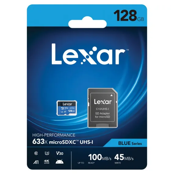 Designed for your smartphone, tablet, or action camera, Lexar® High-Performance BLUE Series 633x microSDHC/microSDXC UHS-I cards let you quickly capture, playback, and transfer 1080p Full HD, 3D, and 4K video, as well as the highest-quality movies, photos, and songs. These high-capacity, Class 10 cards leverage UHS-I technology to deliver high-speed performance - up to 100 MB/s. This premium memory solution includes an SD™ adapter for easy file transfer and provides the speed and space you need to capture more adventure on the go.