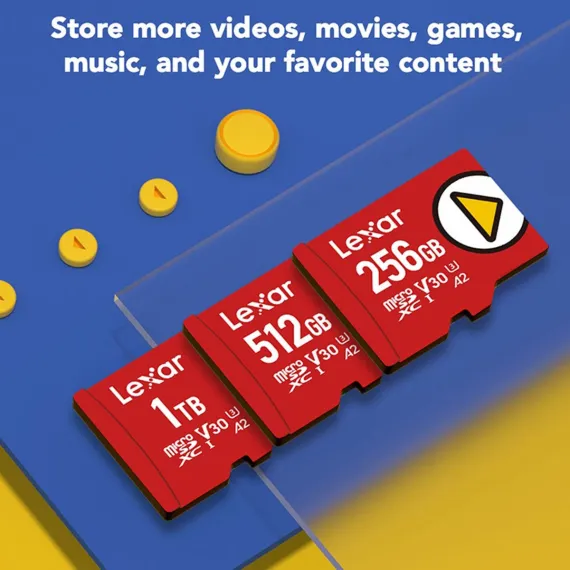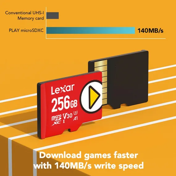 The Lexar® PLAY microSDXC™ UHS-I Card is designed to keep up with all your content, no matter if it's games, video, movies, music, or books. Avoid slow load times with read speeds of up to 205 MB/s and enjoy quick downloads with write speeds up to 140 MB/s. Fast A2-rated performance lets you play more of what you love without missing a beat. Large capacities allow you to save all your favorite multimedia files. With this Card you can capture, play back, and transfer large amounts of Full HD and 4K video. It's ideal for portable gaming devices, smartphones, and tablets.