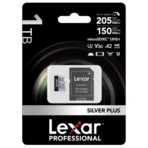 The Lexar® Professional SILVER PLUS microSDXC™ UHS-I Card delivers up to 205 MB/s max read and 150 MB/s max write speeds to help you capture better photos and videos and to accelerate your workflow. Rated V30, it records 4K video at 60 FPS for stunning, stutter-free footage. It’s water-, temperature-, x-ray-, vibration-, magnetic-, shock-, wear-, and drop-proof, and it comes with a lifetime limited warranty for maximum peace of mind.