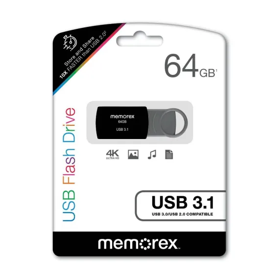 The Memorex USB 3.1 Flash Drive is the ultimate mobile storage solution. Get the most out of the USB 3.1 Gen 1 port on your computer and experience USB 3.1 Gen 1 next generation speed performance with transfer speeds up to 10x faster than USB 2.0! It’s the perfect solution for easily storing and quickly transferring all your large documents, high-resolution photos, HD videos, and more. USB 3.1 offers the same ease-of-use and plug-and-play capabilities as previous generations of USB technologies, but with exceptional speed improvements. Designed for fast and reliable portable storage, the Memorex USB 3.1 Flash Drive is compatible with most PC and Mac laptop and desktop computers with USB 3.1 Gen 1 port. What's more, it is backwards compatible with USB 3.0 and USB 2.0 host devices at standard USB 3.0 and USB 2.0 speeds, respectively.