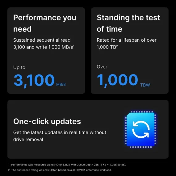 Synology SNV3410/3510 NVMe SSDs are designed to handle tough caching workloads in a 24/7 multi-user environment. Their consistent I/O performance boosts system responsiveness and speeds up handling of frequent access data. Purpose-built for Synology systems, the NVMe solid-state drive line provides a streamlined storage experience while minimizing service disruptions. SNV3410/3510 comes with advanced lifetime analytics3 and is backed by Synology?s 5-year limited warranty.