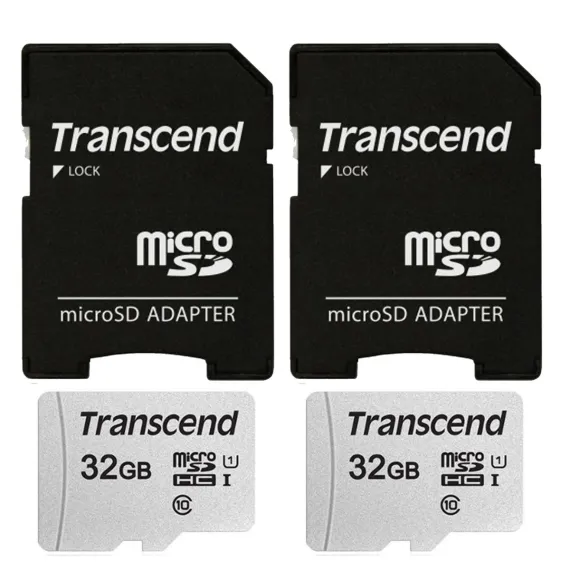 Two Transcend 32GB MicroSD 300s 100MB/s Class 10 Micro SDHC Memory Card with SD Adapter