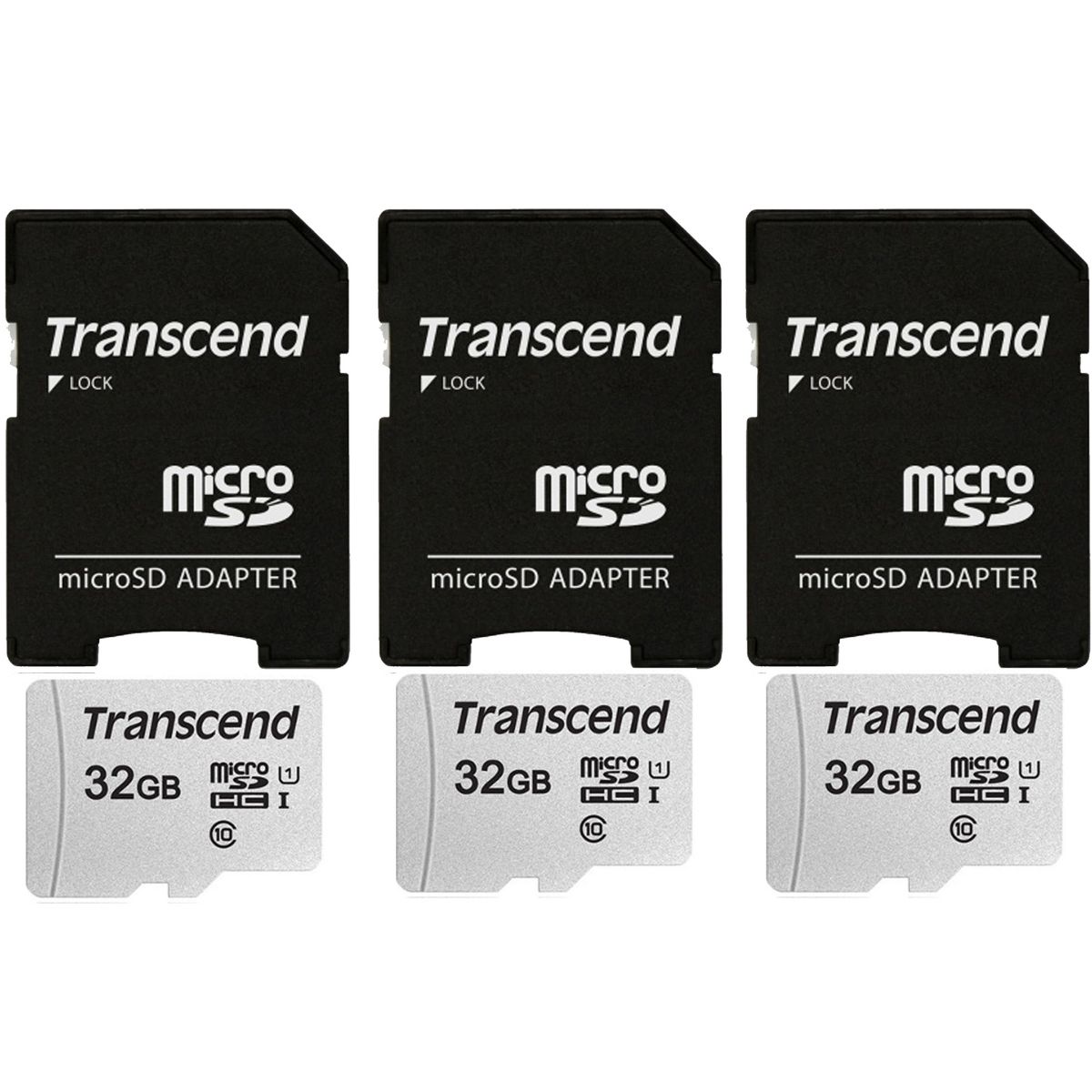 Three Transcend 32GB MicroSD 300s 100MB/s Class 10 Micro SDHC Memory Card with SD Adapter
