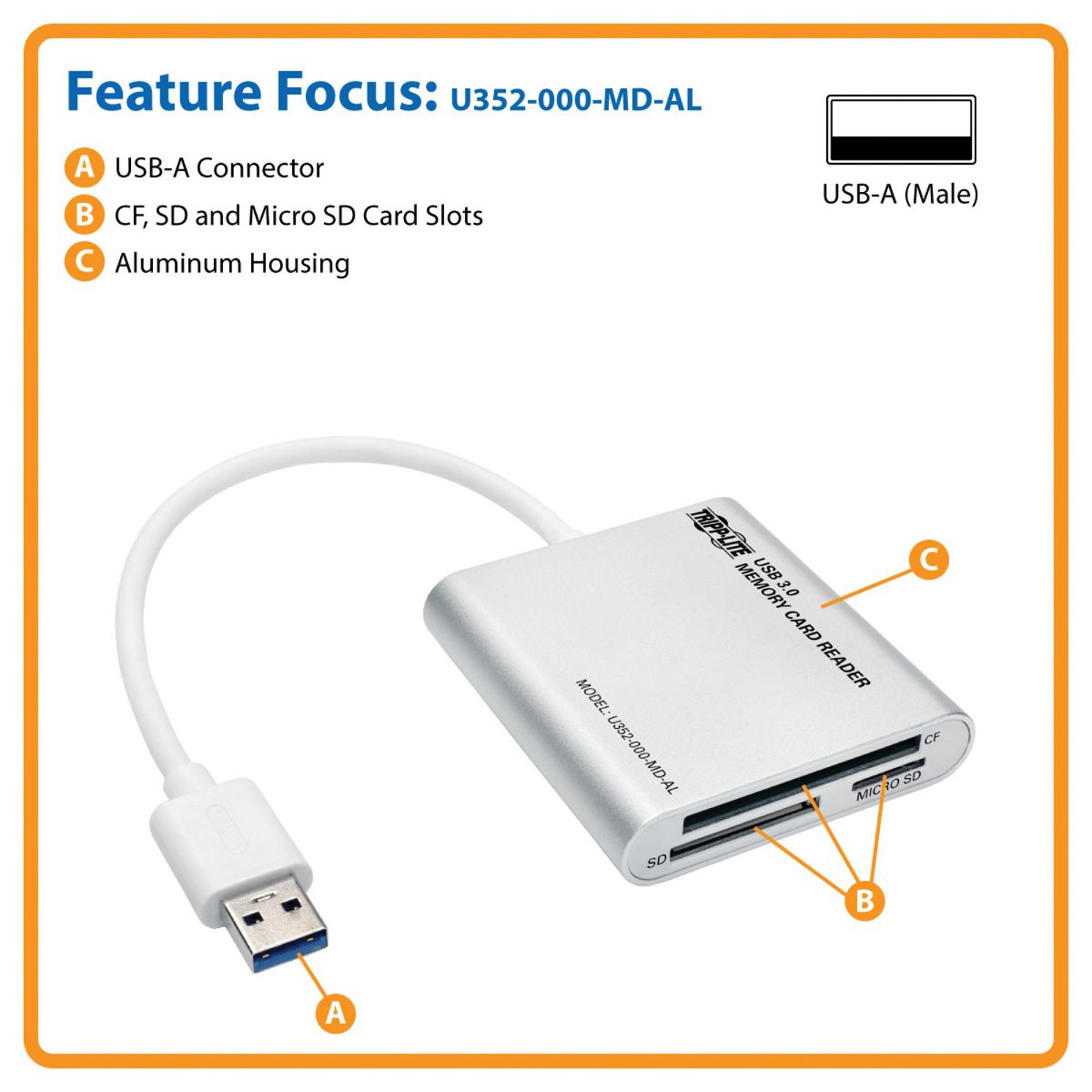 If your tablet, laptop, Ultrabook™, Chromebook™, or computer doesn't have a built-in memory card reader, but does have a USB port, the USB 3.0 Memory Card Reader/Writer from Tripp Lite® by Eaton® can easily transfer data between your device and a wide variety of memory cards. The reader/writer is compatible with a wide range of SD™, microSD™, and CF memory cards. It supports USB 3.0 transfer speeds up to 5 Gbps, which is 10x faster than USB 2.0. It's backward compatible with previous USB generations, so data can still transfer regardless of your device. The compact aluminum case with built-in 6-in. USB cable fits easily into your pocket, backpack, briefcase, or laptop bag, so you can read and write files at a moment's notice. No software, drivers or external power supply required!