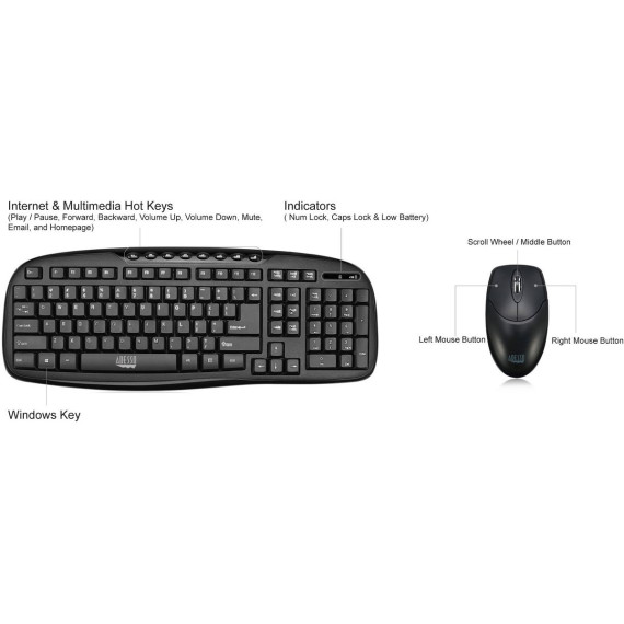 The Adesso WKB-1330CB Wireless Desktop Multimedia Keyboard and mouse combo is a great choice for users who want a stylish designed keyboard along with a mouse for home and office use. The keyboards Hotkeys provide quick access to your media player controls and email. The 3 button mouse is designed with an enhanced optical sensor of 1200 DPI which provides better speed and accuracy. With a 2.4GHz connection, no wires or cords will be tangled and you have a 30 ft range in any direction.