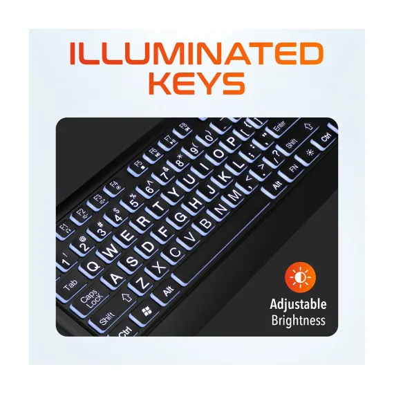 Elevate your typing experience with the Delton KB20 portable keyboard. Built for those who demand clarity and comfort, this backlit keyboard boasts large-print buttons and subtle backlighting, making it perfect for users with low eyesight or seniors seeking ease of use. Whether you're typing during the day or in low-light conditions, the oversize characters and backlighting ensure excellent visibility at all times. The full-size layout, including a convenient numeric keypad, is complemented by dedicated multimedia keys, streamlining your control over volume and more with a single touch. Engineered to reduce fatigue through thoughtfully crafted keys, this computer keyboard invites you to enjoy extended typing sessions without discomfort.