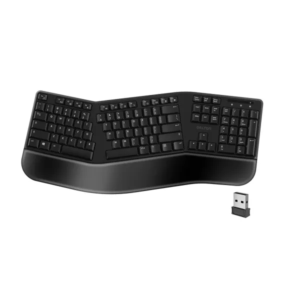 Enhance your workspace with the Delton KB200 wireless keyboard, featuring whisper-quiet keys for focused productivity in any setting. Ergonomically crafted to support a natural typing stance and reduce discomfort, it's backed by rheumatologist recommendations for promoting healthy hand and wrist postures. Enjoy a seamless typing experience with a pillowed wrist rest, keys shaped for your fingertips, and a full numpad for efficient data entry. The split keyboard wireless boasts up to 15 months of battery life with an auto power-saving mode, instant wake-up, and a 2.4GHz wireless connection for unmatched stability over distances up to 8 meters. With its full-sized layout, wide compatibility, and sleek design, this split keyboard is the ultimate tool for precision and comfort in your daily tasks.