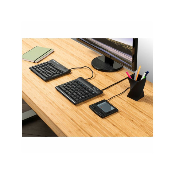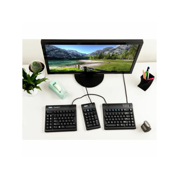 The Kinesis Freestyle2 Keyboard is designed for both office and travel use, featuring a compact, slim profile that reduces wrist extension. This ergonomic keyboard can be adjusted to accommodate users of various body types, allowing for a more personalized typing experience. With its separate left and right keying modules, it provides the flexibility needed for comfortable keying and mousing. The low-force key switches ensure a quiet and smooth typing experience, making it suitable for a range of environments.