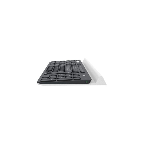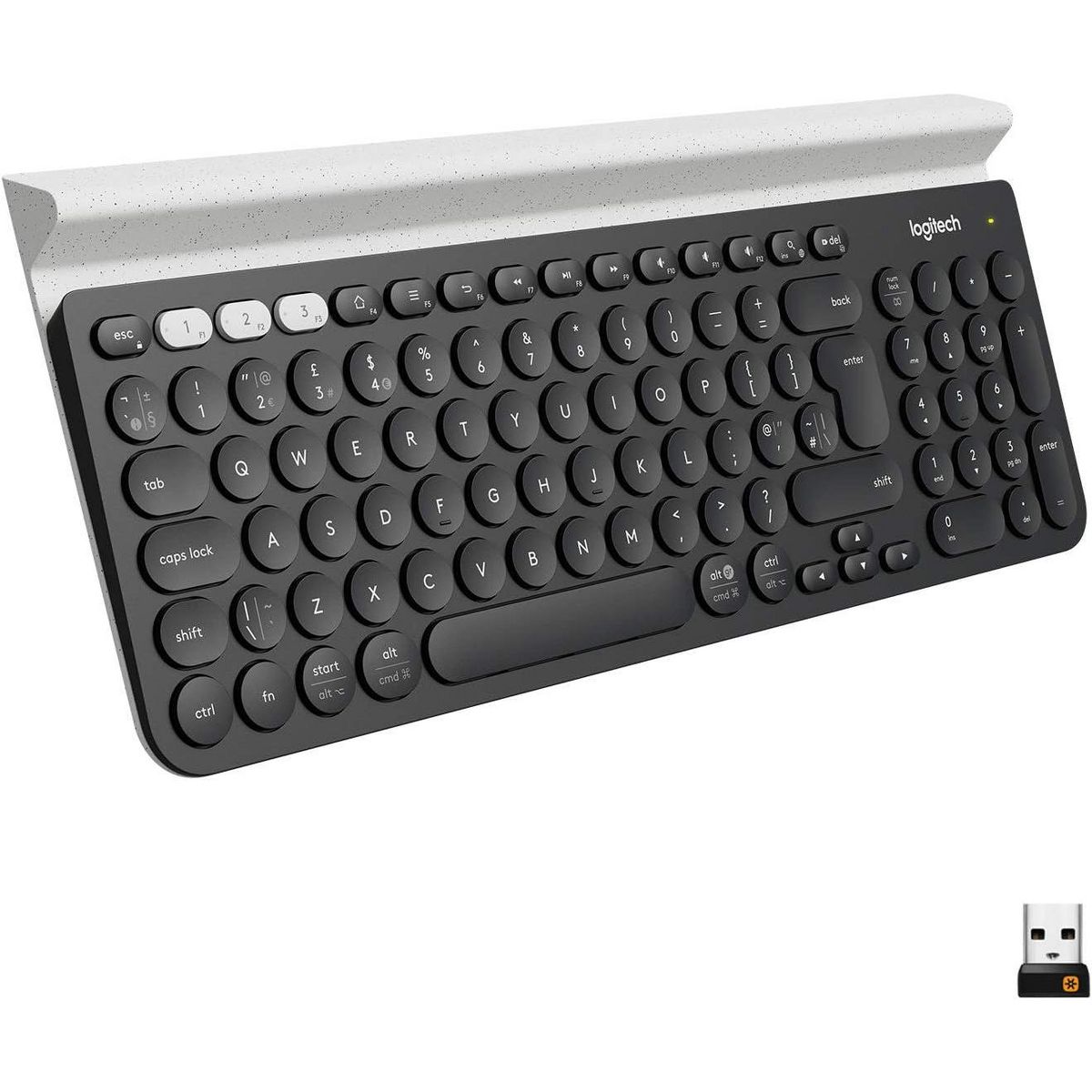 Type with this multi-device Logitech wireless keyboard. The built-in rubber cradle supports devices vertically, making small screens easily viewable, and 128-bit AES encryption keeps information private. Compatible with Windows, Mac, Chrome and Android devices, this Logitech wireless keyboard uses USB and Bluetooth technology to connect to your smartphone and tablet.