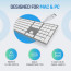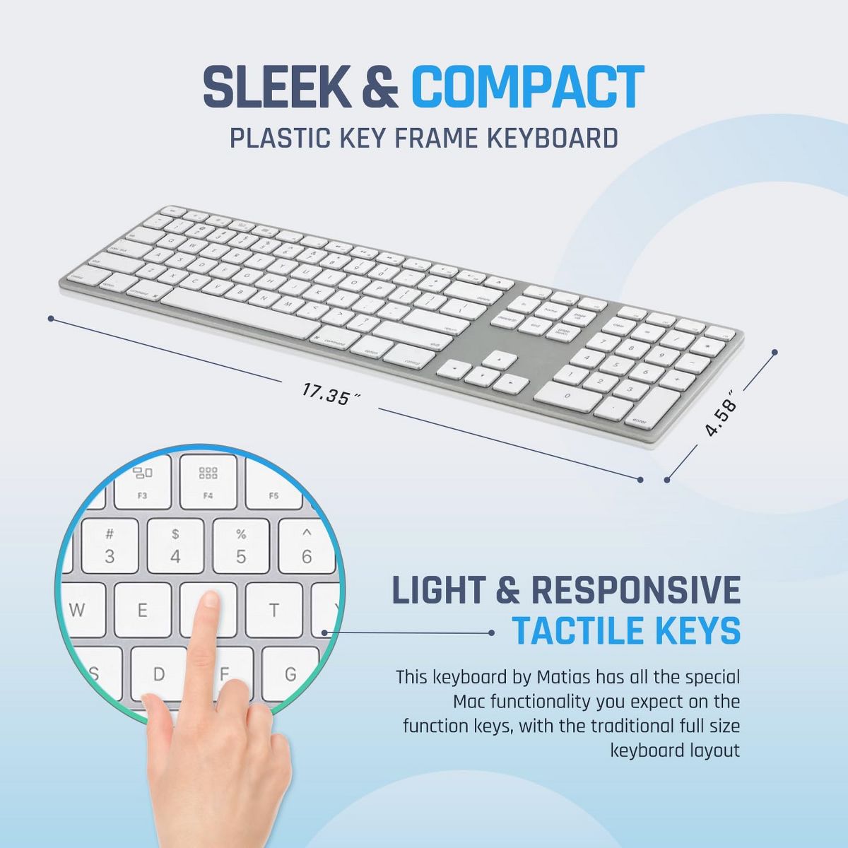 The Matias USB-C Keyboard for Mac is for people who miss Apple's wired USB keyboard. Many people still like the reliability of a traditional USB connection and numeric keypad. This keyboard by Matias has all the special Mac functionality you expect on the function keys, with the traditional full size keyboard layout. This keyboard has a USB-C connection. This model has a plastic keyframe, and does not have a USB hub, so is a budget version of our higher end wired aluminum model.