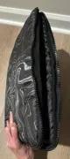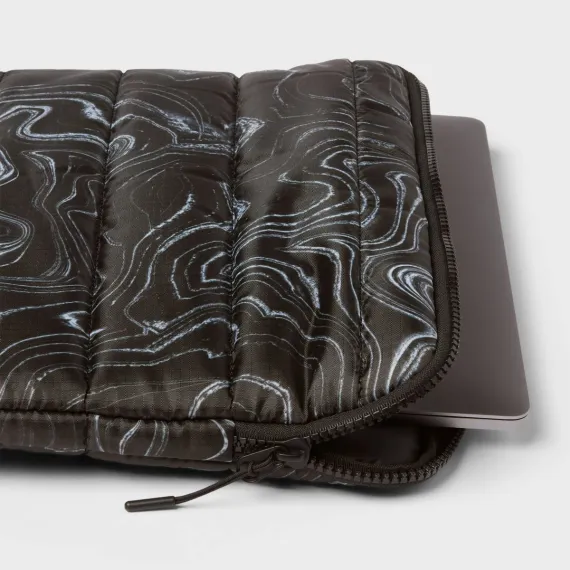 Lots of good features included in this laptop sleeve like the quilted material, the cool graphic print, and the easy to zip zipper closure. My niece uses this sleeve to protect her laptop when she takes it to school. It zips open and close very smoothly. The material is similar to a winter quilted jacket; it provides padding and lies flat so it doesn’t take up a lot of room in her backpack. The swirled marble design on the outside fabric is very attractive.