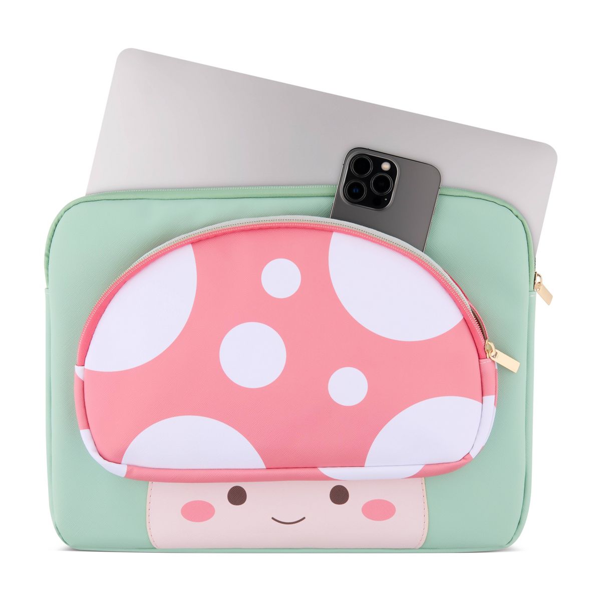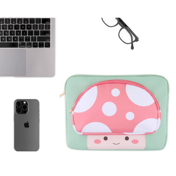 Your new favorite tech sleeve is here. Protect your laptop or tablet with this whimsical Mimicoco mushroom character laptop sleeve that fits up to a 14" device. Designed with your busy lifestyle in mind, this case will protect your device at home or on the go. It has a front pocket for extra storage and a faux fur lining that is protective and durable.