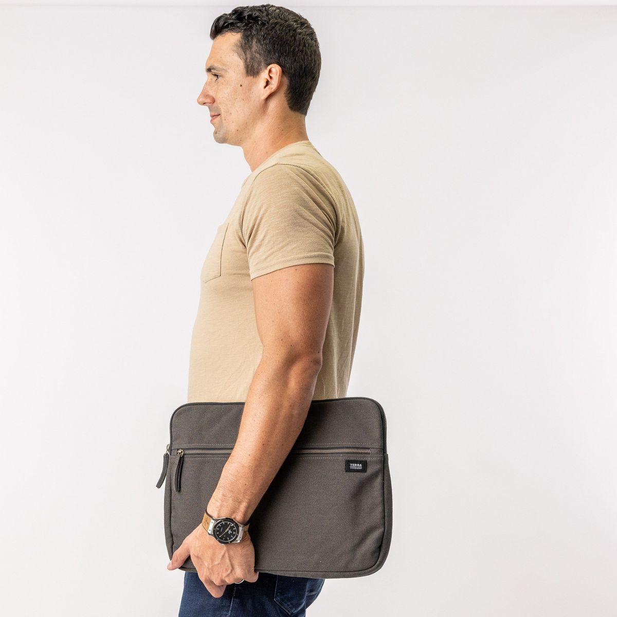 Your laptop is an investment—not only in dollars, but also in the human and earth capital that goes into its making. Protecting your tech and keeping it in use for as long as possible is an important way of reducing its impact on the planet. Made with 14-oz organic cotton canvas and lined with organic cotton fiber for padding and softness, our eco-friendly laptop sleeves are made to protect your machine from the jostling, dust and scratches of transport in a backpack or tote. Made with 14-oz Certified Fairtrade Organic cotton canvas. Made in a Fair Trade Certified™ factory. Note: This laptop sleeve can also hold a 16-inch MacBook Pro.
