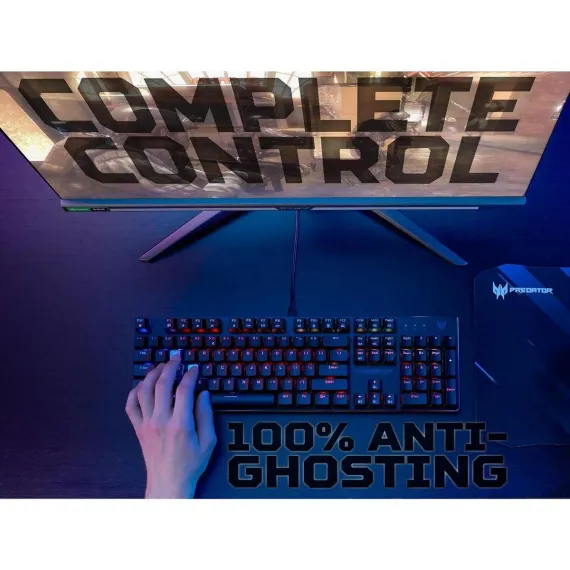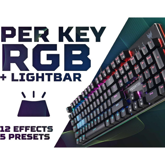The Acer Predator Aethon 303 Wired Gaming Keyboard delivers precision, durability, and dynamic lighting for competitive gamers. Featuring tactile and responsive Kailh Blue mechanical switches, this keyboard ensures crisp actuation for fast-paced gameplay and accurate keystrokes. It boasts 100% anti-ghosting and N-key rollover to register every input, even during intense multi-key commands. With vibrant RGB illumination, 12 backlight effects, 5 pre-set gaming modes, and 3 sidelight effects, you can personalize your setup to match your style or mood. The durable construction and full-size layout offer long-lasting comfort and performance for extended sessions. Designed with gamers in mind, the Aethon 303 blends responsive mechanics with customizable lighting in a sleek black finish, making it an ideal centerpiece for any gaming rig. Whether you're battling in FPS or leading strategy games, this keyboard is built to keep you in control.