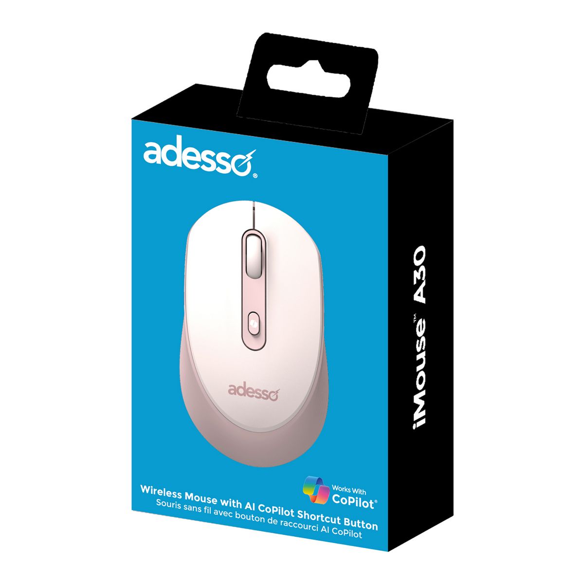 The Adesso® iMouse® A30 is a wireless USB-A mouse designed for everyday comfort and upgraded productivity. It operates over a 2.4-GHz wireless connection with up to 30-ft. range, and features an optical sensor with 1200 DPI for smooth, accurate tracking. With 4 buttons - including a dedicated AI Copilot® shortcut key - and an ambidextrous design, it works equally well for left- or right-handed users. Powered by a single AA battery (included), it’s ideal for users who want a simple mouse with a modern AI-assistant feature._