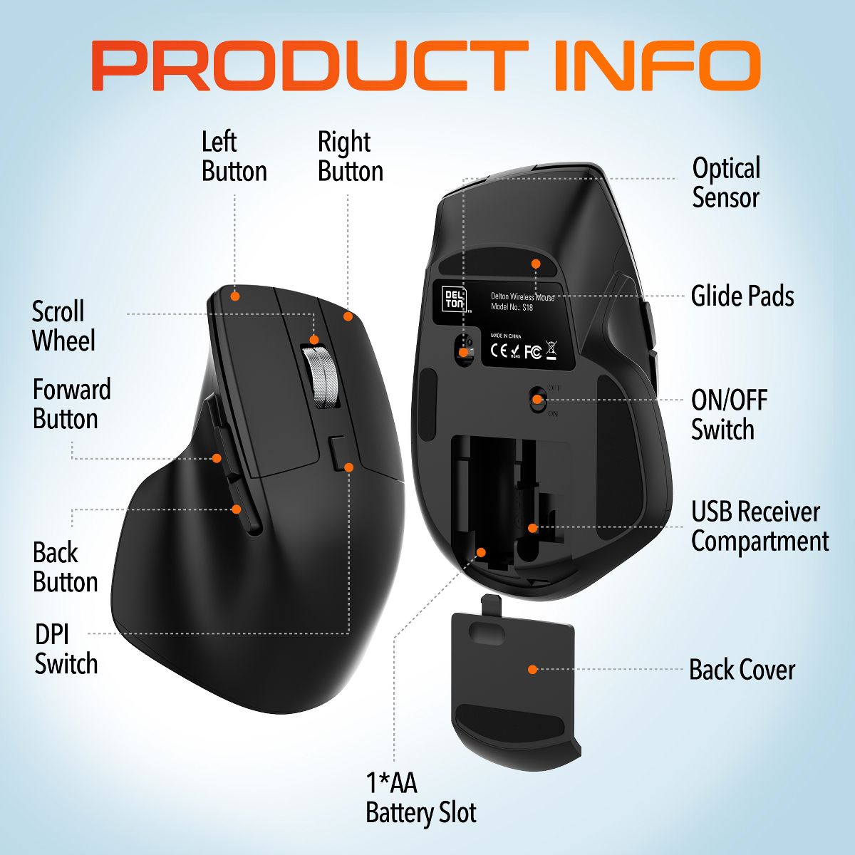 Elevate your office setup with the Delton G18 usb keyboard and mouse combo, designed for enhanced comfort and precision during long work hours. Our usb mouse gives you ergonomic comfort with a flat top design and thumb rest. The wireless keyboard features a pillowed wrist rest for improved typing posture, along with a full-sized, 105-key layout featuring smooth-curvature keys, while the wireless mouse is equipped with an optical sensor for precise tracking and three adjustable DPI levels (800, 1200, 1600). Both devices offer reliable performance with a stable 2.4GHz connection with the mouse having USB-A and USB-C connectivity, while the keyboard uses USB-A connection. They support multi-device connectivity including PCs, laptops, and tablets, and include noiseless buttons for quiet operation.
