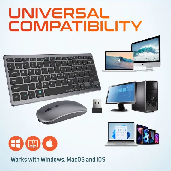 Streamline your workflow with outstanding versatility and comfort using this compact wireless keyboard and mouse combo from Delton. Compatible with Windows, macOS, iOS, Linux, Android and more, the combo offers Bluetooth and 2.4GHz auto-pair USB dongle options for steadfast wireless connectivity. Navigate with ease using the 12 multimedia function keys, and enjoy the liberty of a 30' range. This slim wireless keyboard and mouse combo brings instant wake-up activation and a handy battery life indicator, ensuring you're always prepared for work, play, and everything in between without ever missing a beat. Featuring a slim and compact design, this small wireless keyboard and mouse combo is great for small desks, offices and homes, enhancing modern spaces efficiently.