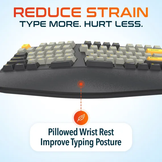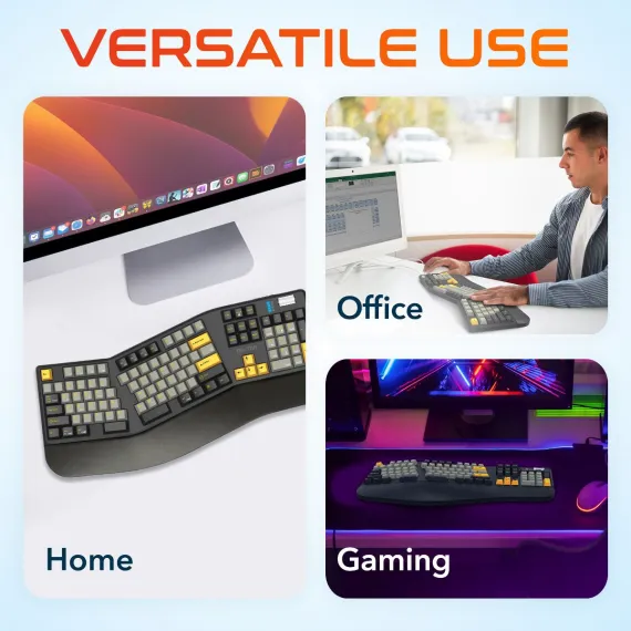 Delton KB450 ergonomic keyboard wireless is designed to deliver comfort and productivity, reducing wrist strain during extended typing, gaming, or working sessions. This wireless mechanical keyboard supports 2.4G wireless, Bluetooth, and USB-C wired connection options, seamlessly adapting to all your devices. Featuring 104 customizable mechanical keys and 105 keycaps, it allows for enhanced versatility and a tailored typing experience. The multimedia shortcut keys offer quick access to volume control and other functions, improving overall usability. With wide compatibility across Windows, Android, iOS, and ChromeOS, this silent mechanical keyboard is ideal for home, office, business, or gaming setups. Enjoy a wireless range of up to 30 feet and a battery life of up to 40 hours, keeping you productive without interruptions.