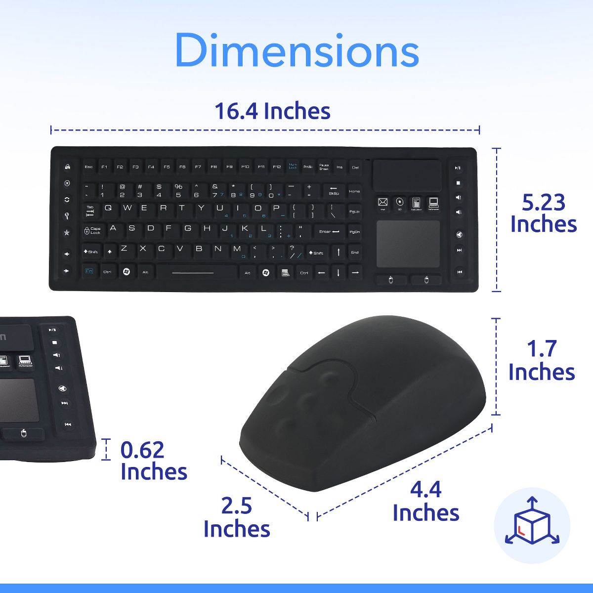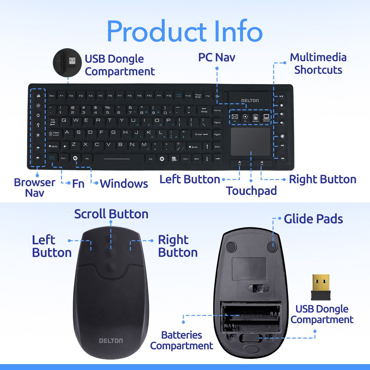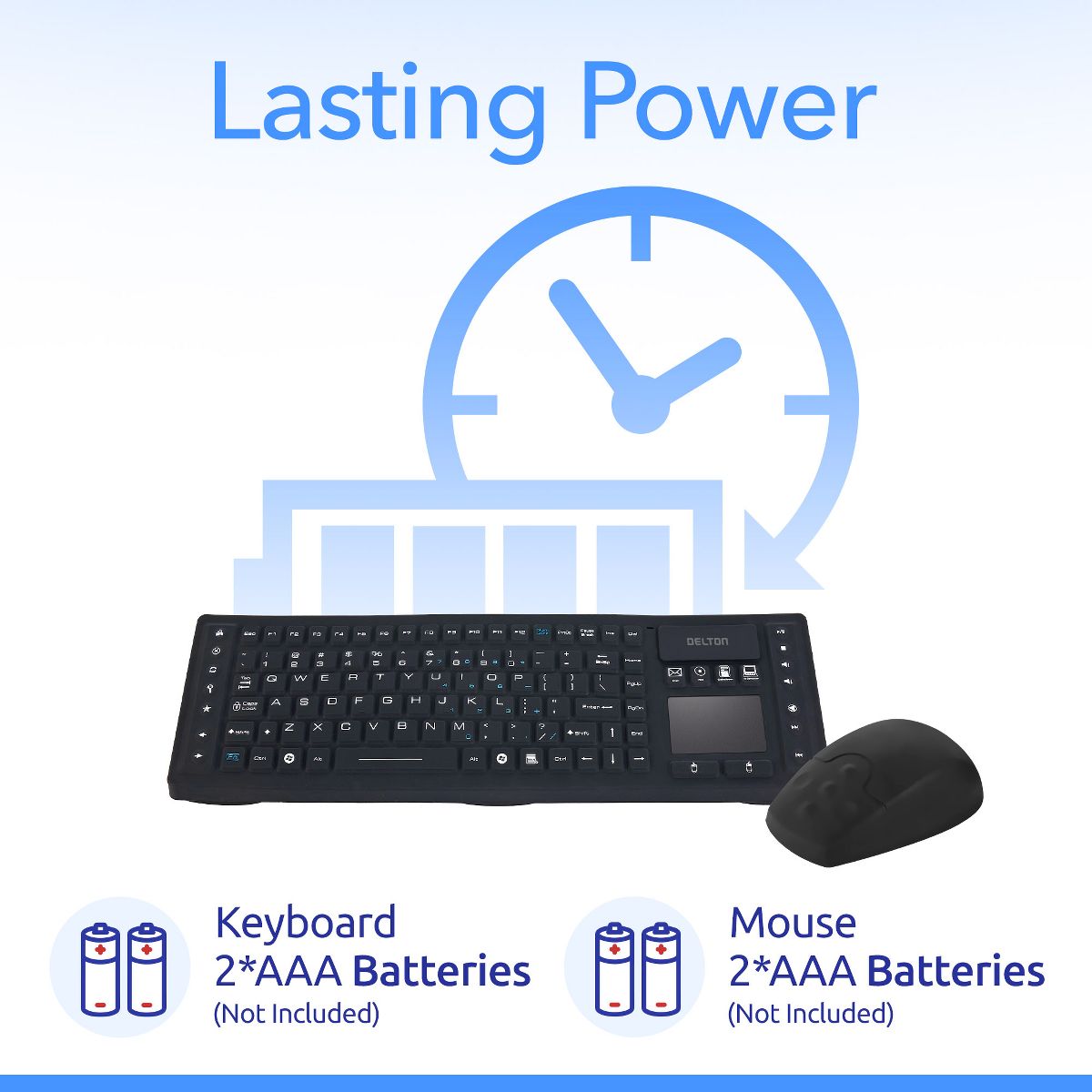 Elevate your workspace with the Delton M90/M44 keyboard and mouse wireless combo, featuring reliable 2.4 GHz connectivity for smooth performance up to 30ft. Designed for plug-and-use convenience, this wireless keyboard and mouse combo connects instantly via a nano USB receiver and offers compatibility across multiple devices and operating systems, including Windows, macOS, Chrome OS, and Linux. The wireless mouse boasts a precise 1,500 DPI laser sensor for smooth cursor movement, with dimensions of 4.48 x 12.55 x 1.61 inches inches. Our silent keyboard features 104 responsive keys, hotkeys, and media controls for enhanced productivity, measuring 16.4 x 5.23 x 0.62 inches, with a touchpad working area of 2.16 x 1.57 inches. Both devices are spill-resistant and feature rubberized surfaces for comfort and reduced fatigue during extended use. With a sleek silicone body and a compact USB receiver, this wireless keyboards and usb mouse combo offers a stylish, durable, and space-saving solution for work even in the messiest environments. Powered by AAA batteries, this silent mouse and wireless keyboard combo delivers consistent performance without the need for recharging.